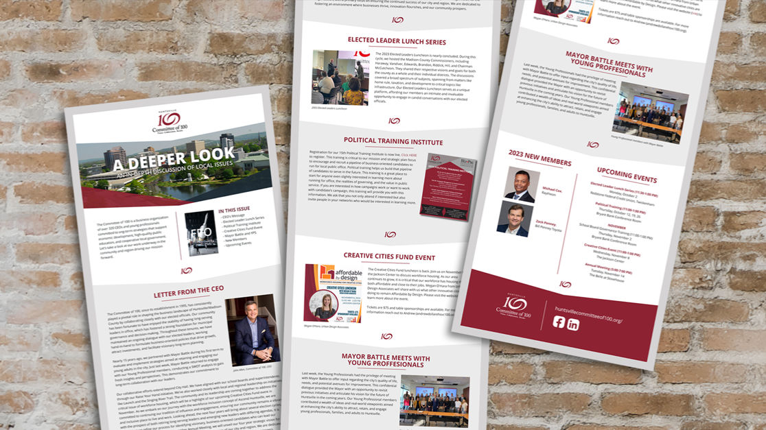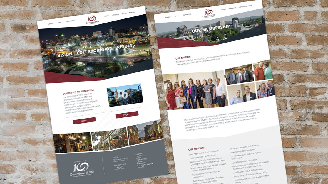 The Committee of 100 is a North Alabama organization of over 330 CEOs and professionals focused on economic development, quality education, and cooperative government. Ad4! collaborated to revitalize their website with targeted content that engaged members and the community. The new site clearly communicated the organization’s vision, supporting business-oriented candidates committed to cooperative local government and public service, helping them connect with and serve the community more effectively.